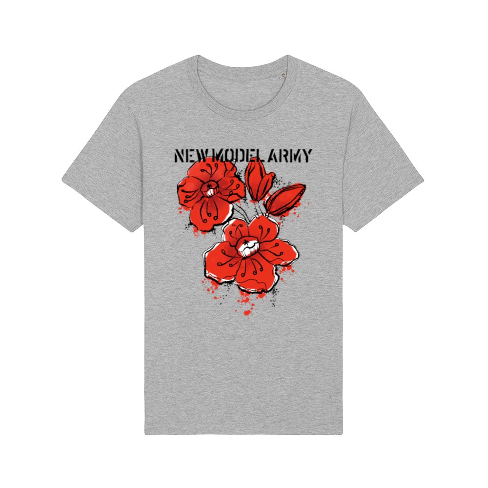 New Model Army Men's Summer Flowers crew neck t-shirt in Heather Grey. This print was created for the 2025 summer shows in Europe and sold extensively by the tour shop. Due to having found a mislabelled box of this design in our warehouse we have decided to offer a small quantiy in the online shop so those fans who couldn't make the tours could still buy one. On the back is the lyric "We all had different reasons to be there.". 100% Cotton