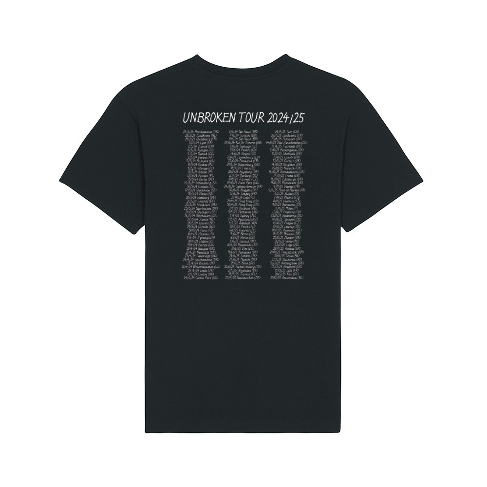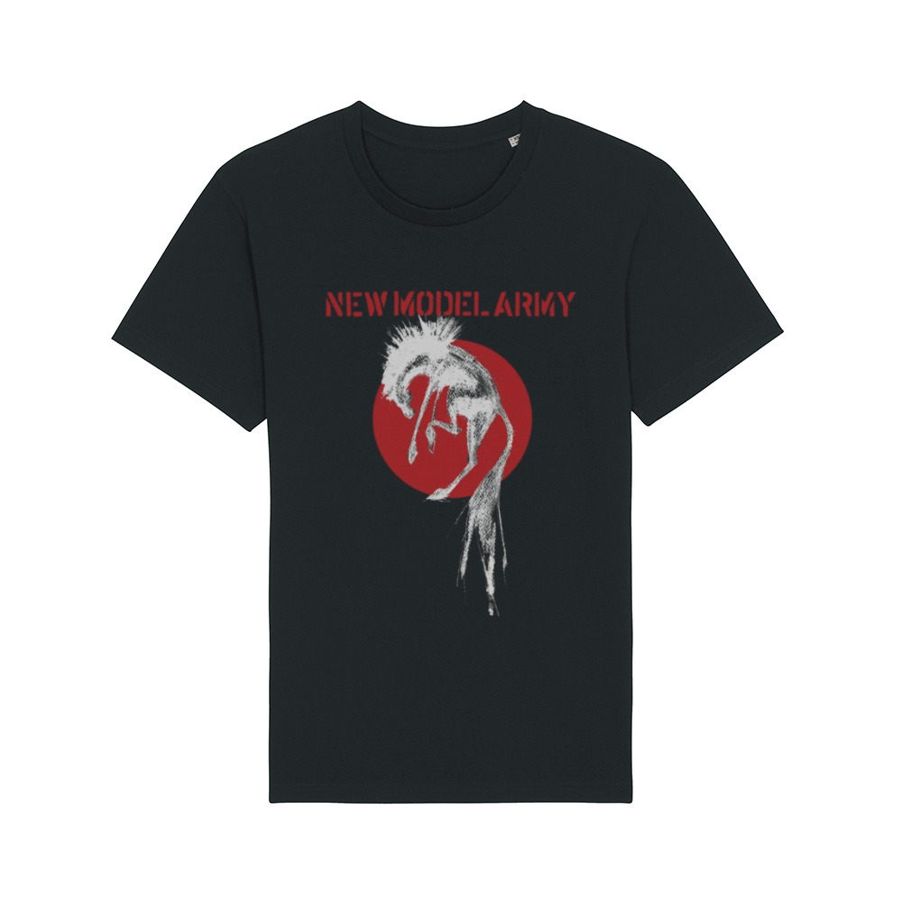 New Model Army Men's Red Mustang Black crew neck t-shirt has been created as the latest design accompanying the Unbroken album. On the back is the Unbroken Tour Dates from 2024/25, something that we don't do anymore, but as the tour and the album have been incedibly popular and we performed in a great many and varied places, we felt it was the perfect time to do this. 100% Cotton